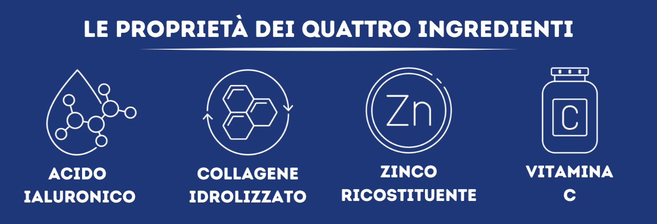 - 2000 mg di Collagene Idrolizzato di tipo I - migliora la struttura e l’elasticità cutanea